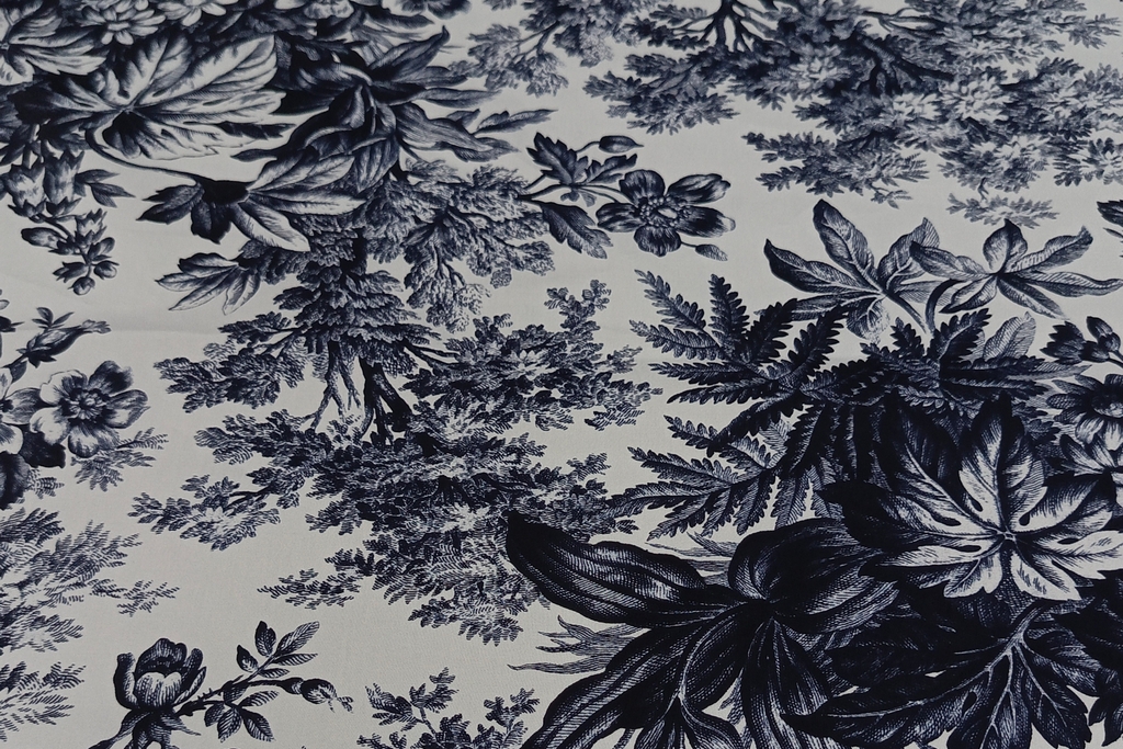 Итальянский лен с хлопком в жаккардовом переплетении нитей молочного, черного и синего цветов.  Хорошо драпируется, не грубая, не тянется. Подойдет для пошива рубашки, костюма, платья, сарафана.